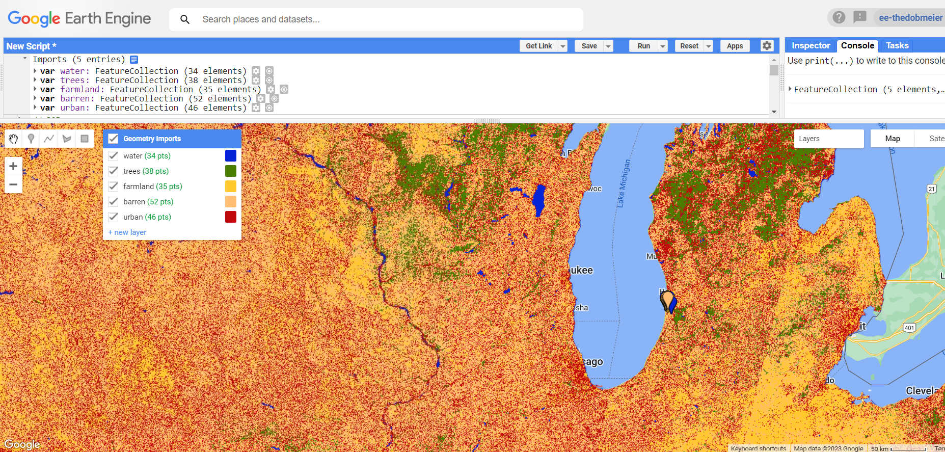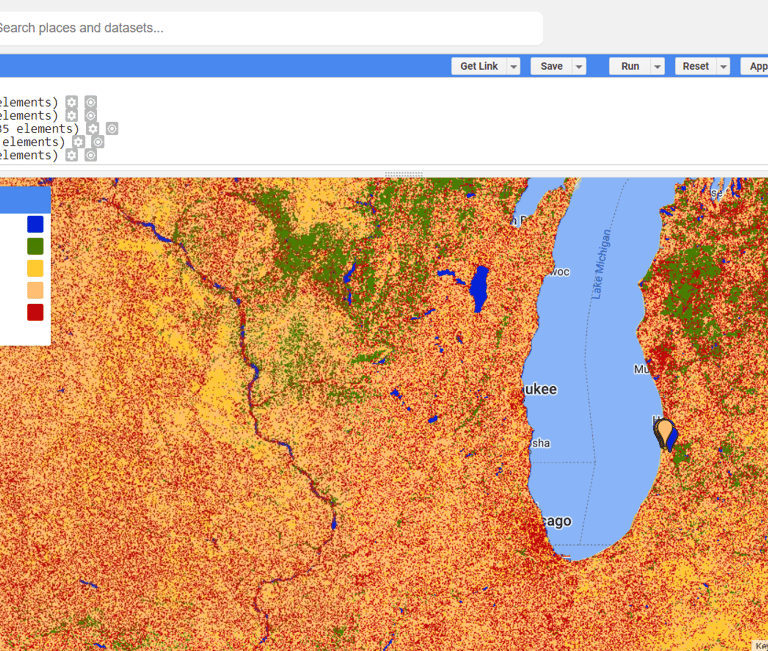 Next, I created classifiers for a handful of feature classes: water (blue), tree plots (green), farmland (yellow), barren land (orange), and urban areas (red). I could've probably differentiated the colors better so that the last three classifiers didn't all blend together. I trained the classifiers on Saugatuck-Douglas, MI - an arbitrary but beautiful area (ideally, I would've trained it on several different cities, but I didn't want to take a full day to do this). Using the training dataset, I ran the classifiers on the rest of the US (see the comparison of tree-plot coverage below between Google Earth imagery and my machine-learning experiment).